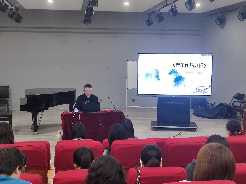 11月1日上午,公司教师邵良柱在艺术楼八音讲堂为本次省培学员讲授《音乐作品分析》,使学员能够真正了解音乐的内涵。