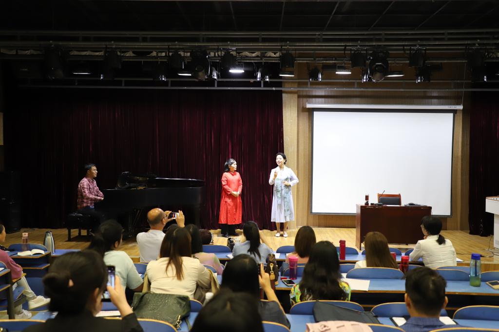 19日上午,黄慧慧以《歌唱表演之我见为题,从歌唱表演要素出发,强调声、形、神、情是现代声乐表演的四大基本审美要素表演者只有在演唱中兼顾四大要素才能获得较好的舞台表现效果,正所谓“有道而无艺, 则物虽形于心, 不形于手。” “一身之戏在于脸,一脸之戏在于眼。”黄慧慧在随后的公开课中,根据学员的演唱情况,从眼神、肢体语言和情感的把握三个方面,进行细致地讲解并亲自示范,其绘声绘色的表演,赢得了在场的老师和同学们阵阵热烈的掌声。