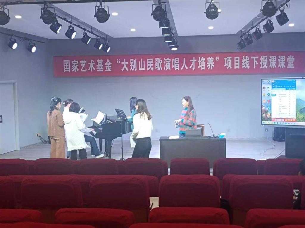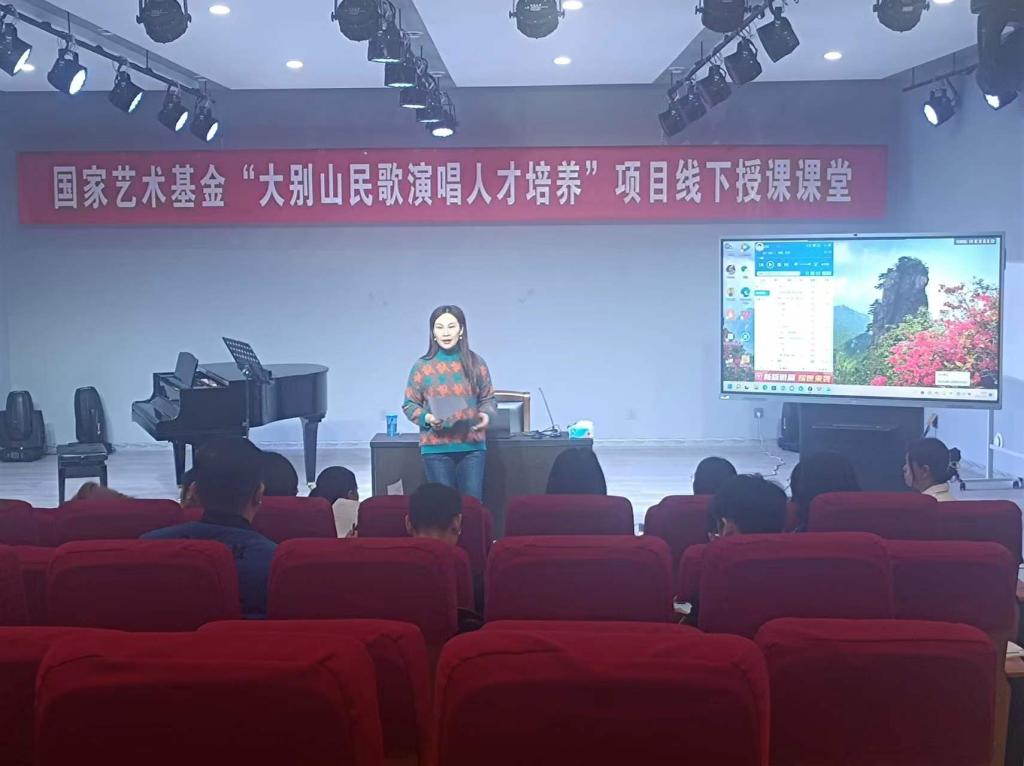 3月15日上午,国家艺术基金“大别山民歌演唱人才培养”线下授课课堂在公司英国365集团一楼八音讲堂火热进行中。信阳民歌歌唱家,大别山民歌传承人,信阳市民歌研究会副主席李鸣凤应公司邀,以《豫南小调(一)》为题进行线下教学。