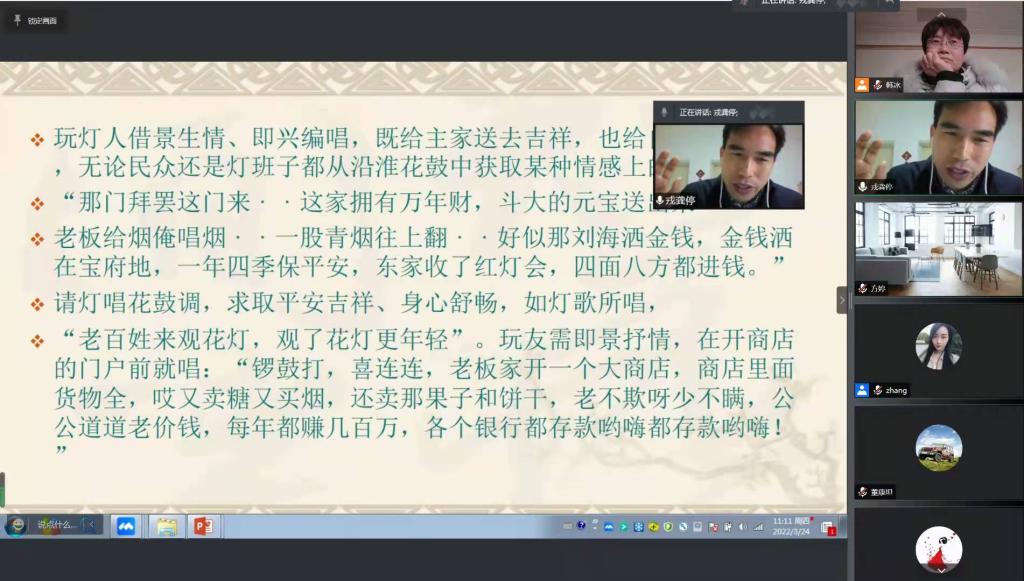 3月24日上午,英国365集团国家艺术基金“大别山民歌演唱人才培养”项目继续开展。由阜阳师范大学音乐舞蹈公司戎龚停教授,受邀为学员们进行了以《红灯会礼俗语境中的大别山民歌》为题的授课,探讨了大别山民歌表演艺术与民俗事项之间的关系。