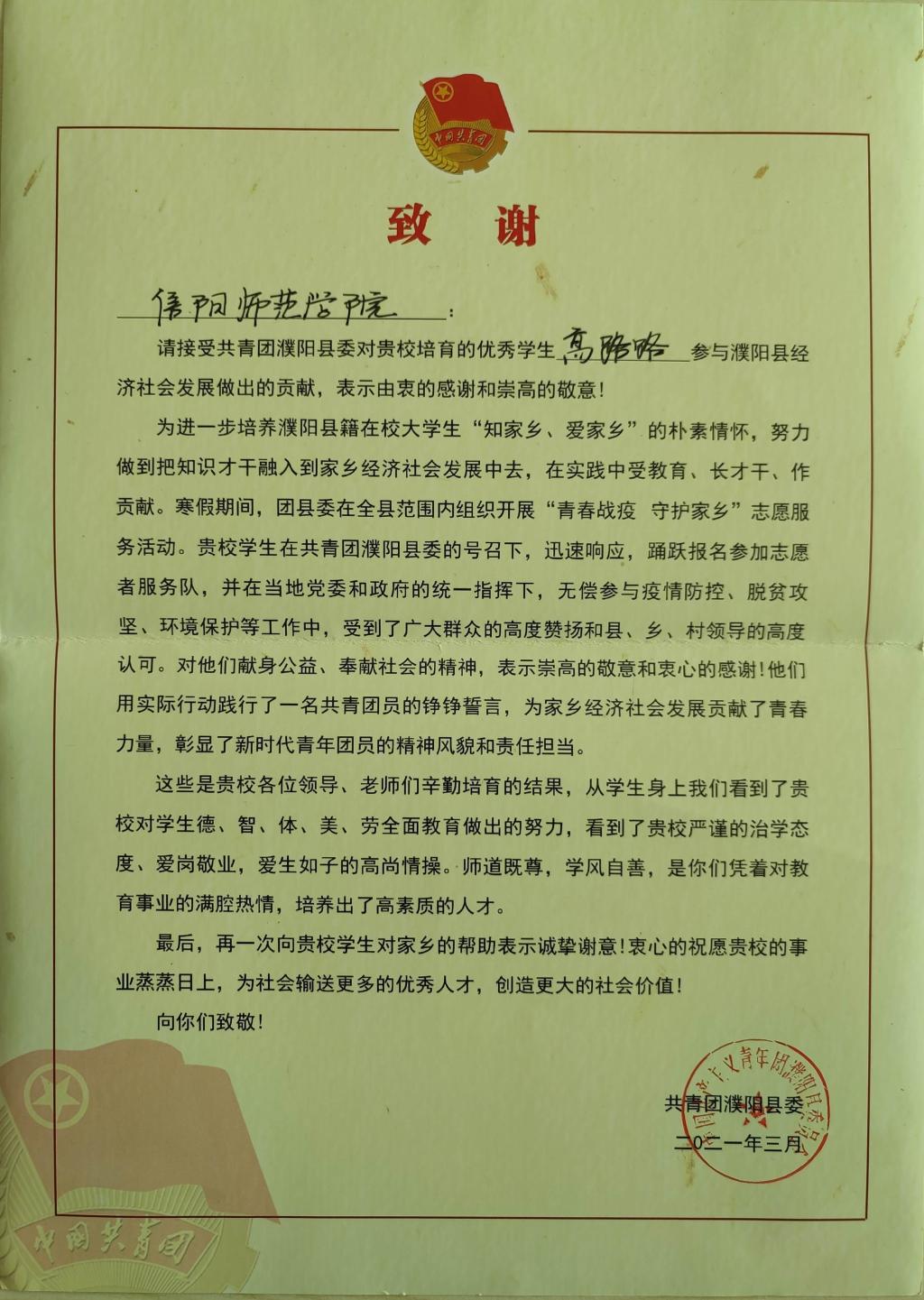 信中提到,高路路同学积极响应共青团濮阳县委的号召,主动请缨,披上志愿者的红袍,踊跃报名、有序参加志愿者服务队。努力做到把知识才干融入到家乡经济社会发展中去,在实践中受教育,长才干,作贡献。高路路同学在当地党委和政府的统一指挥下,无偿参与疫情防控、脱贫攻坚等工作中,受到了广大群众和县、乡、村领导的高度认可。高路路同学用实际行动践行了一名新时代共青团员的铮铮誓言,彰显了新时代老员工德、智、体、美、劳全面发展的风范,展现了青年团员无私奉献、不求回报的高尚节操和一丝不苟、认真负责的工作态度。
