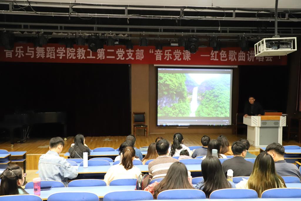 讲唱会通过讲演和示范红色音乐作品的形式,重温党的革命奋斗史,讴歌党的奋斗历程,领略先烈的丰功伟绩。“双带头人”赵洋洋老师用歌剧《长征》构建了一幅红军长征的生动图谱,反映这一伟大的英雄史诗;张锦峰老师歌曲《把一切献给党》表达了一个和平年代的共产党员终身入党的心声;赵要钦老师歌曲《革命人永远是年轻》描述了在改革开放的今天,青春与变革、与创新相伴,在全新的意义上延续着革命的精神。