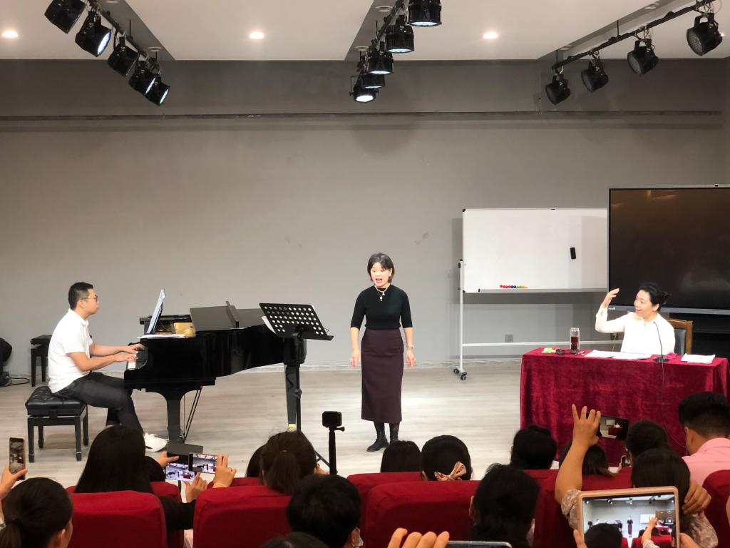 在随后的指导教学中,黄慧慧教授鼓励各位师生在加强声乐基础知识学习的同时,尤其要加强对中国声乐作品的演唱与传承,扩大音乐视野,培养对中国声乐作品的感受能力、理解能力、鉴赏能力,陶冶高尚的艺术情操,形成正确的艺术观。在现场一对一的实践教学中,黄慧慧还从戏歌的演唱技巧、民歌的地域特点的把握、古曲咬字吐字的运用等方面进行了具体的讲解和示范。讲座中,黄慧慧专讲解细致耐心,其幽默风趣的语言和扎实的专业能力赢得了现场阵阵掌声。