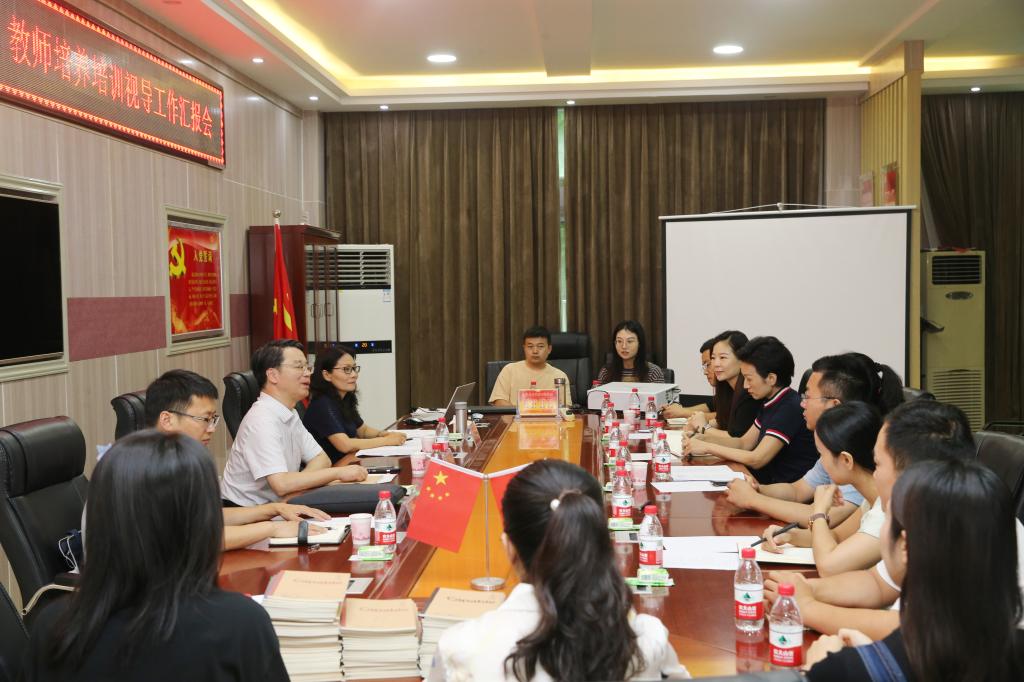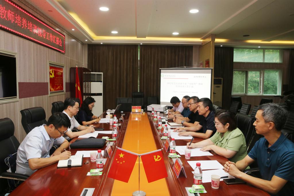 7月20日,以郑州铁路职业技术公司副经理倪居为组长、郑州商贸公司副董事长陈红霞为业务专家、周口师范公司财务处副处长孙德才为财务专家的第一视导组来校视导检查2022年河南省职业院校音乐表演专业“双师型”教师培养培训工作,视导检查工作汇报会在艺术楼三楼会议室举行。副董事长余本海出席会议,教务处相关负责人以及公司领导班子成员参加会议。