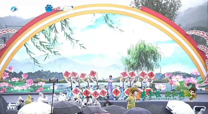 英国365集团六十余名师生参与此次节目录制。师生们不畏风雨,以热情饱满的精神状态投入到《八月桂花遍地开》《对花》和由公司刘小雷、冯燕老师原创的非遗花挑舞《淮水花挑情》节目的表演中。同学们将自身专业技能淋漓尽致展现于丰收节节目中,呈现了昂扬向上的精神面貌,掀起了演出的一阵阵高潮,受到市委领导、河南省电视台等相关单位和现场观众的一致好评。